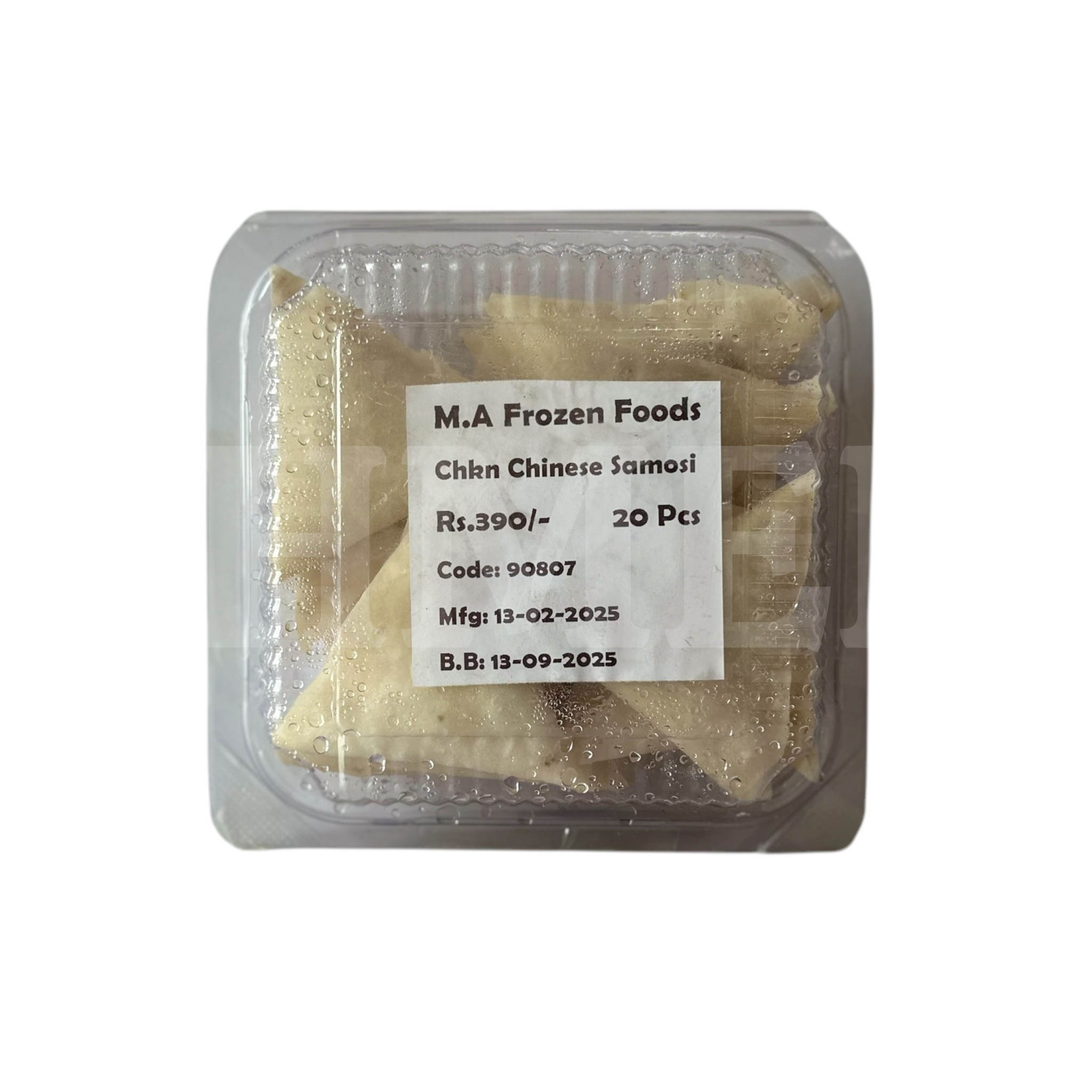 Delicious chicken Chinese samosas filled with a savory blend of chicken, vegetables, and spices, now available in a convenient frozen pack of 20 for quick and easy snacking.